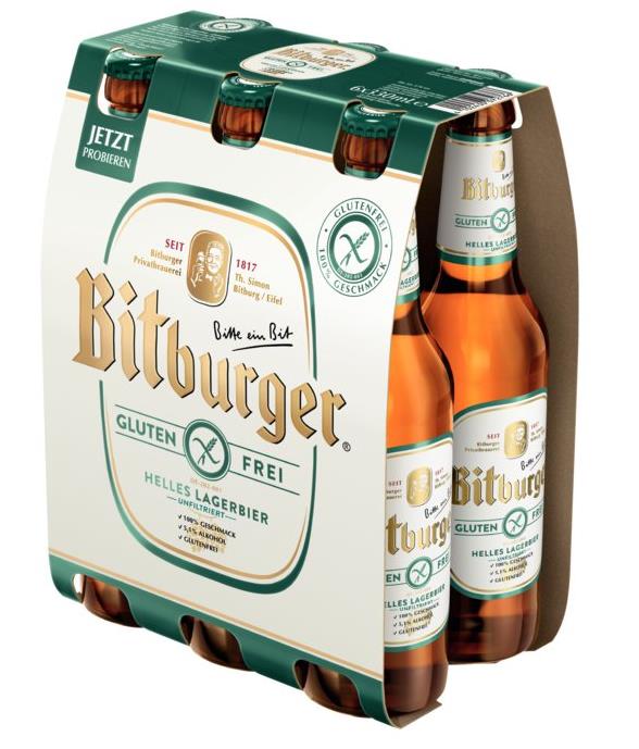 Geschmack: Ein vollmundiges und feinmalzig-hopfiges Bier mit 5,1 % vol Alkohol – aber ganz ohne Gluten. Mit unserem Bitburger Helles Lagerbier – glutenfrei kann auch bei einer Glutenunverträglichkeit unverfälschter Biergeschmack genossen werden. Mit Wasser, Gerstenmalz und Hopfen eingebraut, wird unser glutenfreies Lagerbier mit bestem Bitburger Siegelhopfen verfeinert und reift und lagert mehrere Wochen lang. Durch ein besonderes Verfahren wird dem Bier anschließend das Gluten entzogen. So gut kann Bier schmecken – jetzt auch glutenfrei.