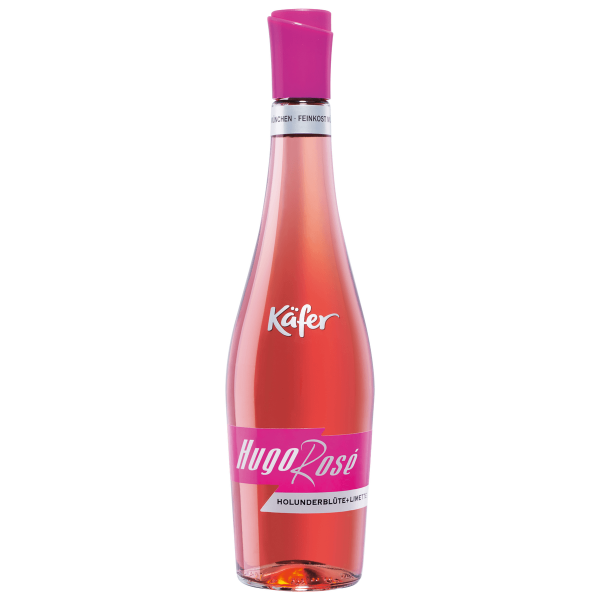 Käfer Hugo Rosè, Genuss pur. Das fruchtig frische Kultgetränk jetzt auch in der zarten Rosé Variante. Ein erfrischender Cocktail mit Roséwein und natürlichen Holunderblüten- und Limettenextrakten.
